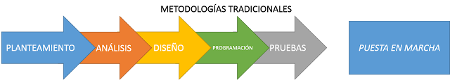 La organización del trabajo de las metodologías tradicionales es lineal es decir las etapas se suceden una tras otra y no se puede empezar la siguiente sin terminar la anterior. Tampoco se puede volver hacia atrás una vez se ha cambiado de etapa. Estas metodologías no se adaptan nada bien a los cambios y el mundo actual cambia constantemente.